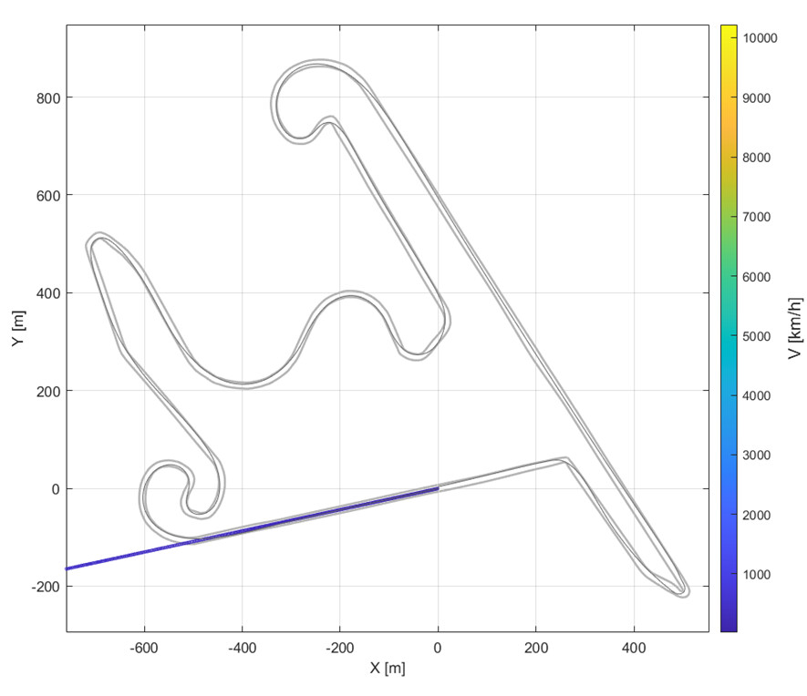 Trajectory tracking: The vehicle does not follow the reference trajectory properly – it cuts corners significantly, especially in tight turns (see attached figure: gray = reference, blue = actual, color = speed).