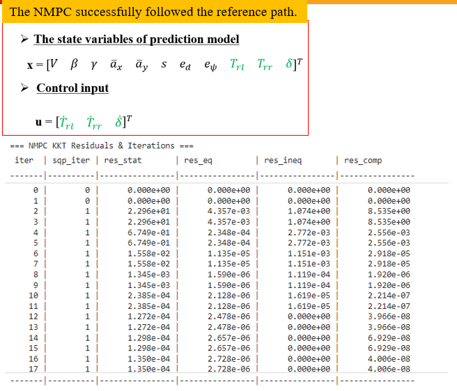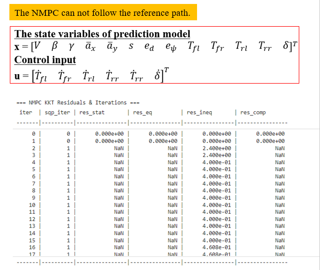 I am working on a nonlinear model predictive control (NMPC) problem for a racing car using the Matlab interface of Acados. The goal is to control the racing car to follow a given trajectory while minimizing control effort. The trajectory optimization also using Acados solver and successfull. I’m using the below model: