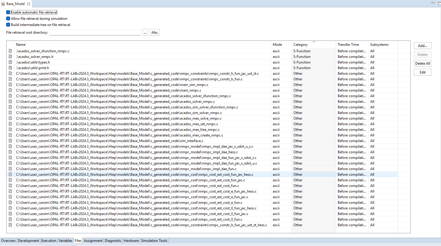 I am using ACADOS with Simulink (s-function) for an MPC problem. The ACADOs files run and work very will with Matlab, Simulink Normal run, and Simulink Accelerator run. Next step is to build and run the model on OPAL-RT target machine.