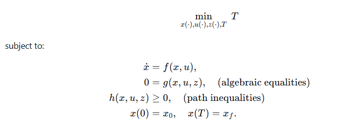 Ideally, something that combines a minimum-time objective with auxiliary algebraic constraints (DAE or implicit form).